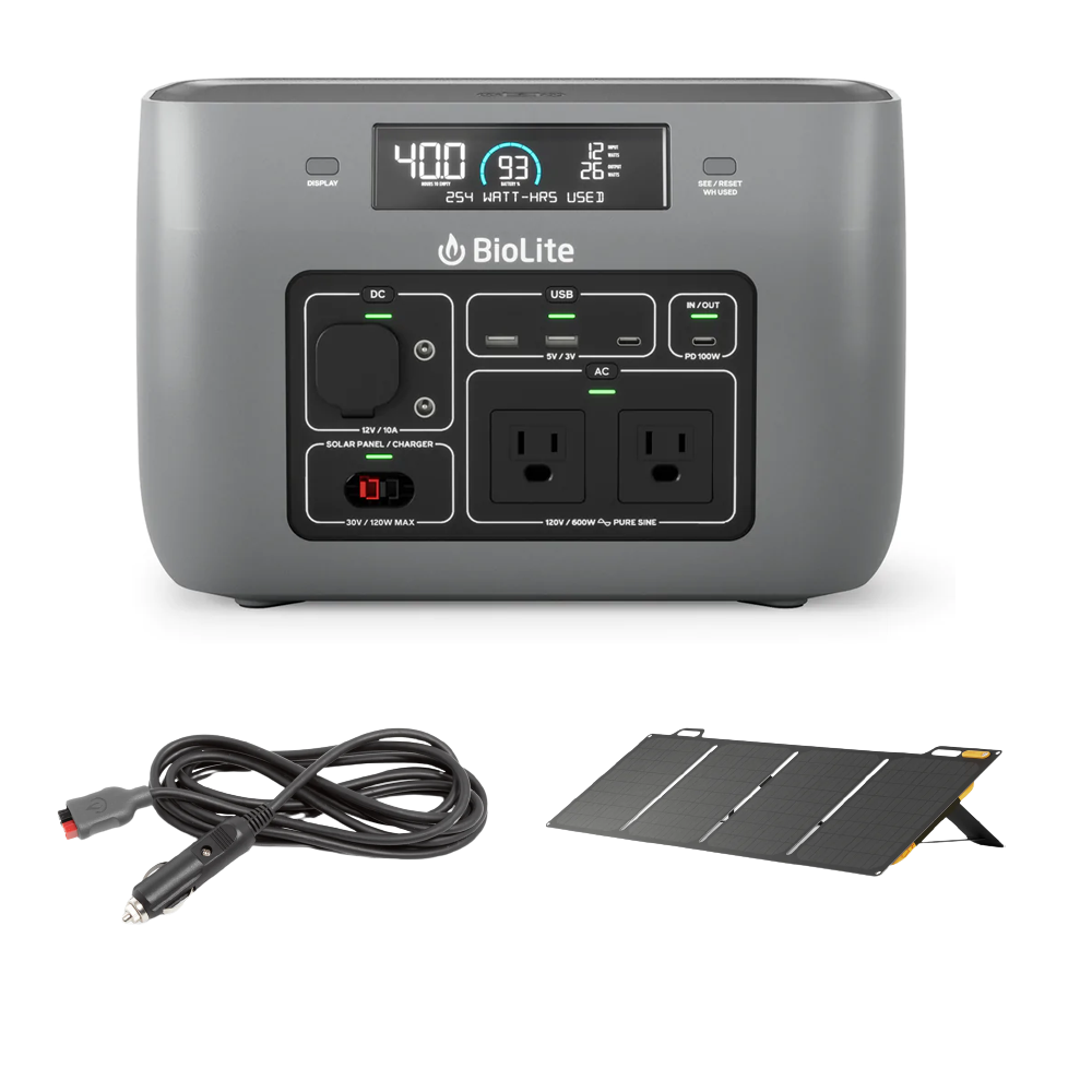 Промоционален комплект BioLite, включващ зарядна станция BioLite BaseCharge 600 + Соларен панел BioLite Solarpanel 100 + Кабел BioLite 12V Car Charging Cable 10 FT