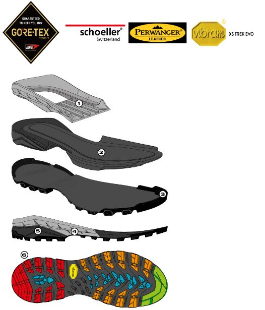 Горната част е от 1,7-1,9 mm велурена кожа Perwanger®, която е водоустойчива, дишаща, устойчива и издръжлива на надрасквания. Благодарение, на което се постига добра по-висока защита в областта на глезена за още по-добра опора, защита и комфорт благодарение на Autofit 3D яката, която е изработена от подплатена материя, способна да стабилизира целия крак без точки на натиск и дискомфорт. Езикът е свързан с горните две странични части на обувката, което го стабилизира в центъра и предотвратява навлизането на камъни, кал и сняг. Платът Schoeller поддържа идеалната температура на краката, независимо от промените във външната температура.